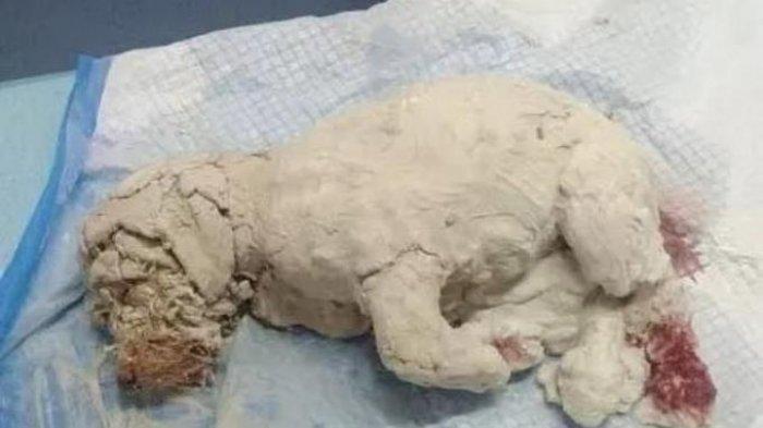 Gambar dan video yang beredar menunjukkan tubuh anjing yang tertutupi adonan berwarna putih.