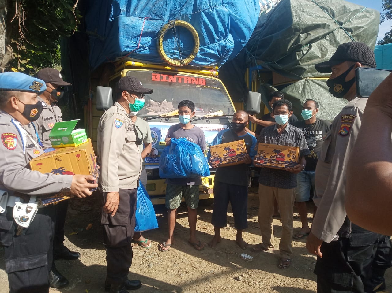 Kepada para sopir truk, Polsek Kawasan Pelabuhan Lembar membagikan makanan, air minum, dan masker.