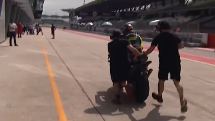 Pembalap dari VR46 Racing Team, Luca Marini terpaksa harus diseret kembali ke Pit Stop, akibat kelalaian kru tim yang tidak mengisi bahan bakar.
