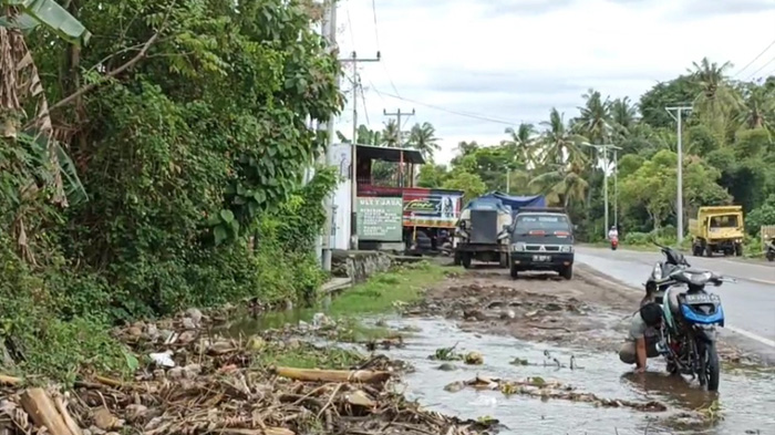 "Kalau ndak salah, ini (aliran air) sudah ada kurang lebih sejak satu bulan yang lalu," kata Aminah, warga setempat yang sedang berjalan melewati pinggiran jalan tersebut.