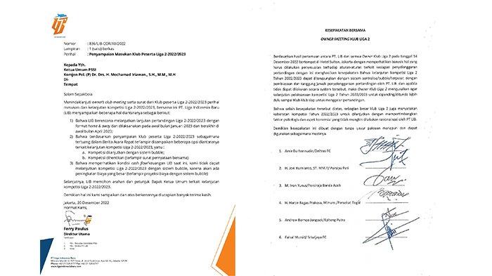 "Kami kembali sampaikan bahwa surat klub yang menjadi pertimbangan kami, dan seharusnya dalam lampiran adalah 'Kesepakatan bersama owner meeting klub Liga 2' pada tanggal 14 Desember 2022,” tambahnya.