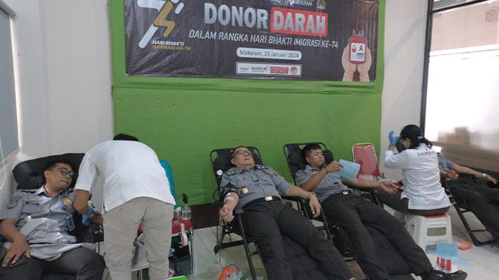 TRIBUNLOMBOK.COM – Kanwil Kemenkumham NTB bersama Kantor Imigrasi Kelas I TPI Mataram menggelar kegiatan donor darah dalam rangka peringatan ke-74 Hari Bhakti Imigrasi di Ruang Legal Drafter Kanwil Kemenkumham NTB, Selasa (23/1/2024).