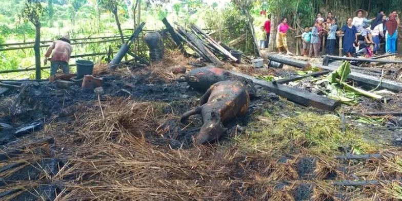 "Akibat kejadian itu dua ekor sapi milik korban mati terbakar aau terpanggang, api berhasil dipadamkan menggunakan alat seadanya oleh tetangga rumah sekitar," kata Nikolas.