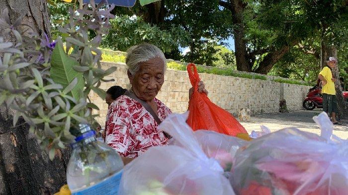 Dengan hanya beralaskan tikar seadanya, Ni Nengah duduk sembari merapikan jualannya. Tampak kulit keriputnya yang terpapar sinar matahari yang cukup menyengat, lantaran tempatnya berjualan hanya mengandalkan pohon untuk dirinya berteduh.