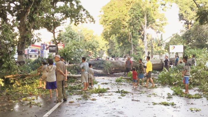Hujan lebat disertai angin kencang menyebabkan pohon-pohon besar di Kota Mataram tumbang, Minggu (10/4/2022). Arus lalu lintas pun dialihkan.