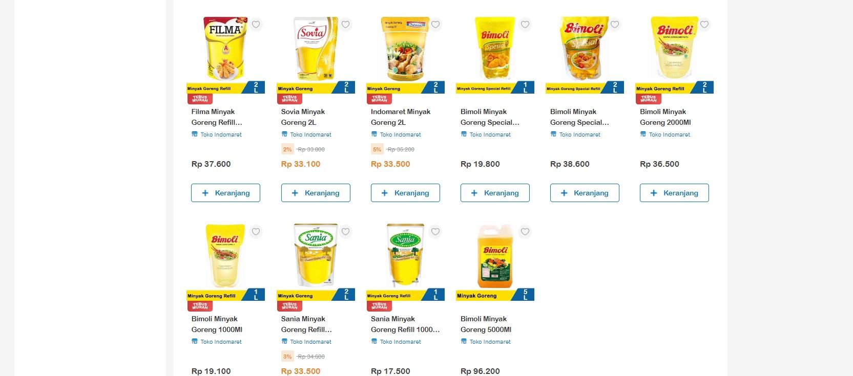 Harga minyak goreng di Indomaret dan Superindo hari ini, Jumat 12 Mei 2023. Filma 2L Indomaret Rp 35.900, sementara Bimoli 2L Superindo Rp 36.900.
